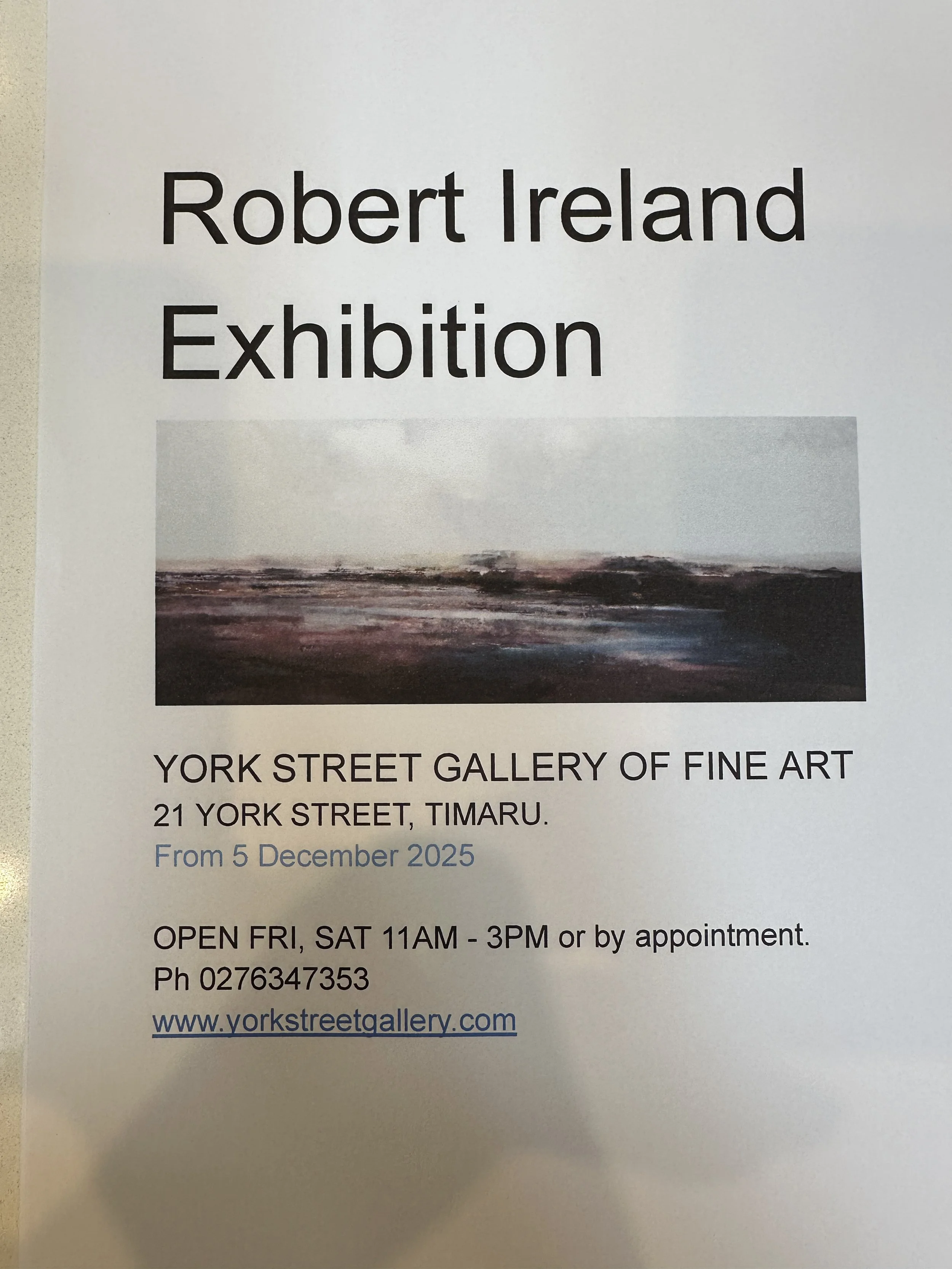 Robert Ireland exhibition Thursday, December 4, 2025 1:00 PM 2:00 PM 13:00 14:00 York Street Gallery of Fine Art 21 York Street Timaru, Canterbury, 7910 New Zealand (map) Google Calendar ICS